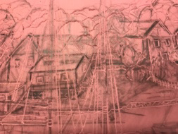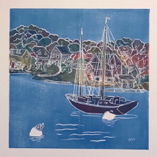 Linocuts are “relief” prints. The raised portion receives the ink (Unlike intaglio etchings, which are inscribed into a metal plate). Printmaking is a particularly fine media for working in relief, traditionally using simply black or sepia ink on white paper. The positive and negative areas of the image are enhanced by the strong contrast of flat color. When creating a monochrome print, the juxtapositioning of color blocks is especially important. The printmaker must consider which parts of the picture should receive the colored ink, and since these will be the raised portions of the relief print, I must carve away all areas that will not receive the color. The process is often the revers of many direct art forms, such as drawing. Here is a linocut print