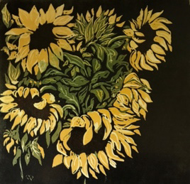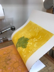 Reduction prints are multi-colored relief prints made by printing one color at a time, using the same lino block. To preserve each color as it is overprinted with subsequent colors, areas of the block are carved away. The result is a completely destroyed printing block and beautiful, multi-color prints.
